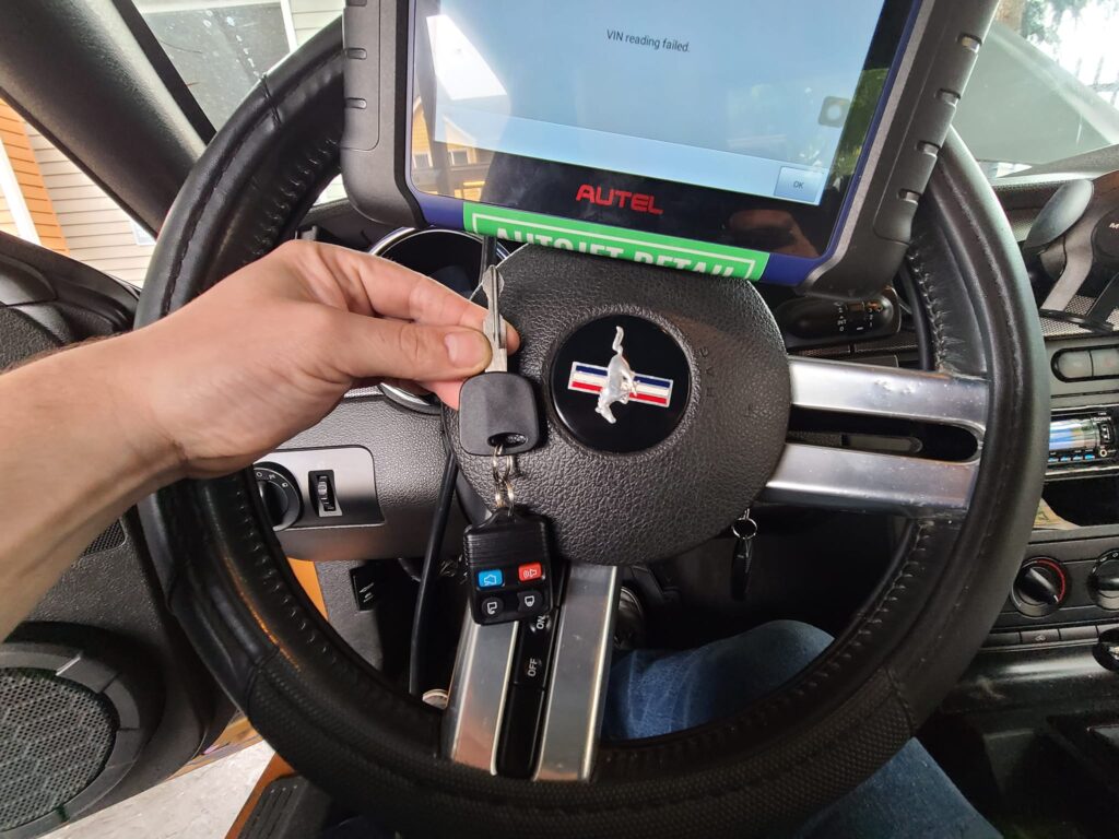 Customerโs remote buttons hadnโt worked in years. Cut and programmed a modern Ford flip key with logo. Back in action!